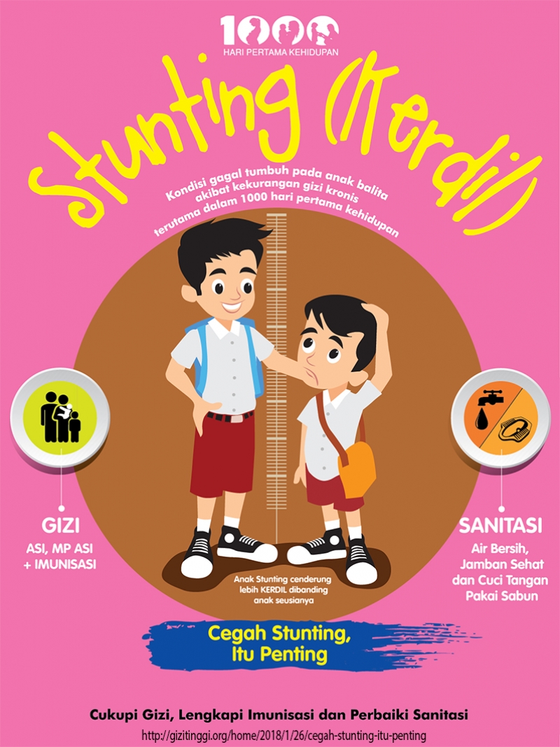 Stunting adalah masalah kurang gizi kronis yang disebabkan oleh asupan gizi kurang dalam waktu cukup lama akibat pemberian makanan yang tidak sesuai dengan kebutuhan gizi. Stunting terjadi sejak janin dalam kandungan dan baru tampak jelas saat anak berusia dua tahun. Kekurangan gizi pada usia dini meningkatkan angka kematian bayi dan anak, yang menyebabkan penderita mudah sakit dan memiliki porstur tubuh tidak maksimal saat usia dewasa. Kemampuan kognitif penderita stunting pun berkurang sehingga mengakibatkan kerugian jangka panjang bagi Indonesia.