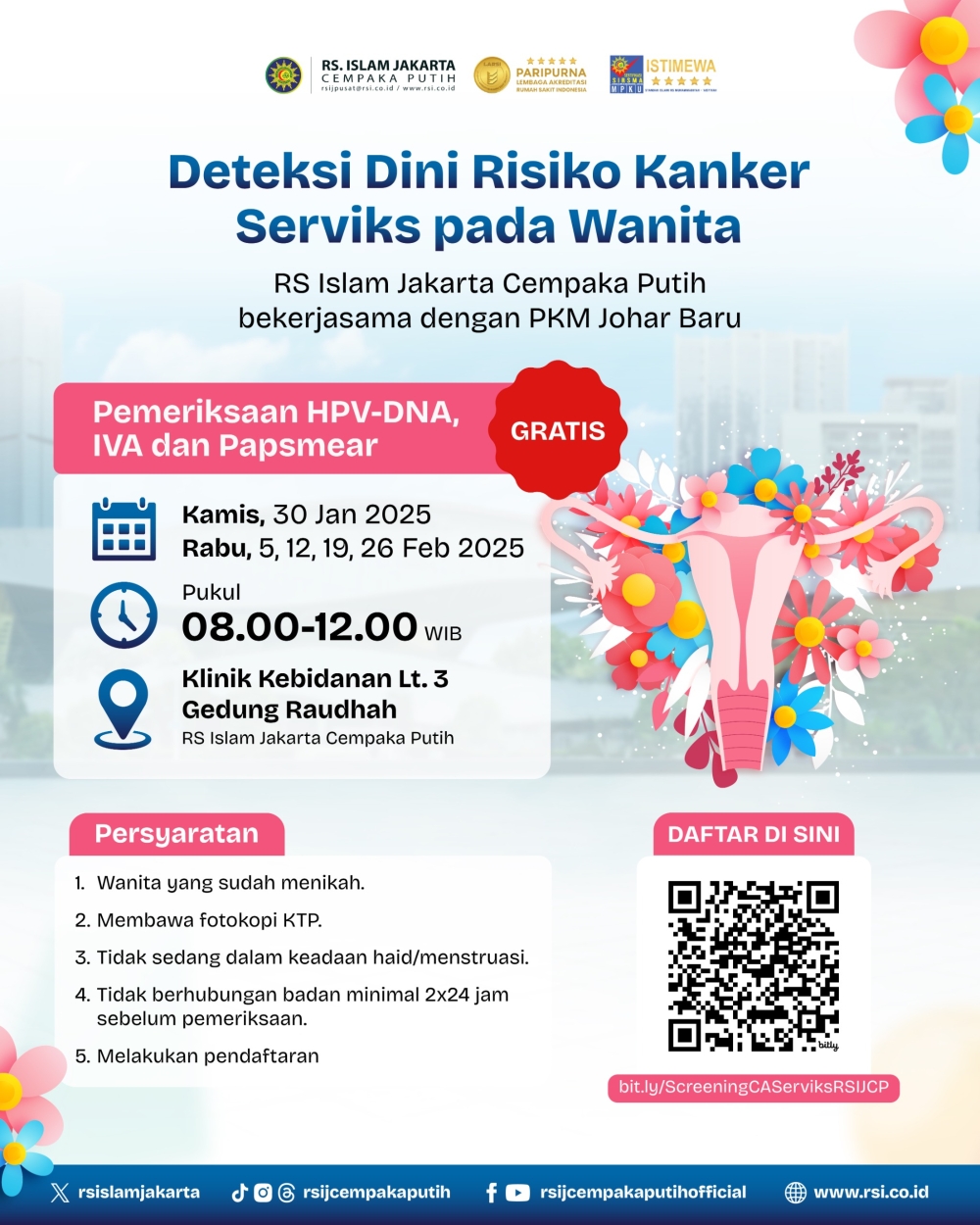 Kabar baik bagi wanita yang ingin melakukan deteksi dini kanker serviks! RS Islam Jakarta Cempaka Putih menyediakan pemeriksaan skrining GRATIS yang bekerjasam dengan PKM JOHAR BARU.