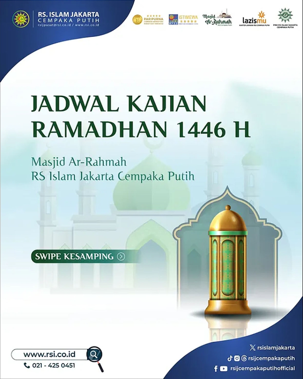 Pertebal ilmu dan perkuat iman dengan menghadiri #KajianRamadhan Masjid Ar-Rahmah RS Islam Jakarta Cempaka Putih yang digelar ba'da dzuhur selama bulan Ramadhan.