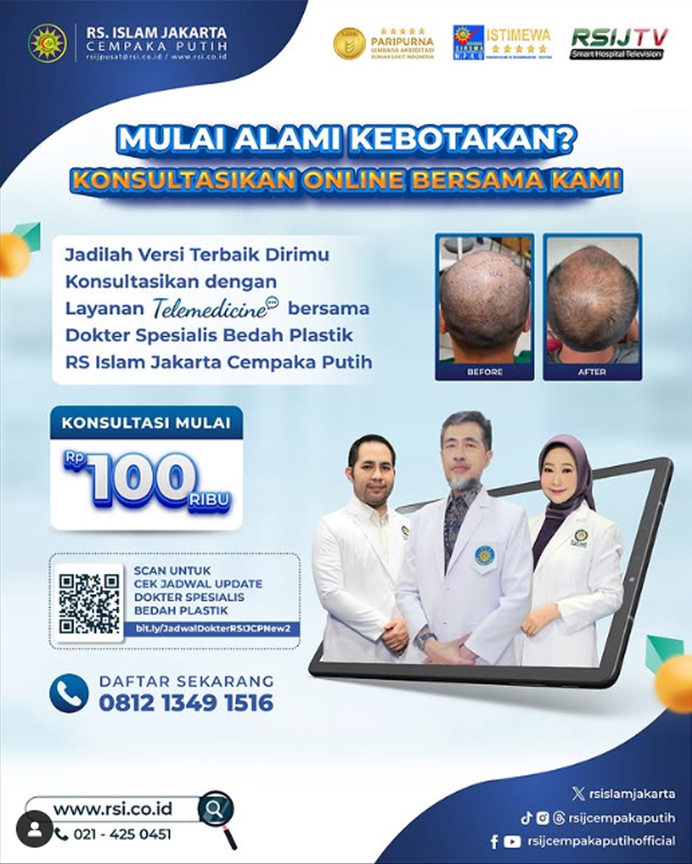 Ini menjawab keresahan sahabat semua yang punya masalah kebotakan, Alhamdulillah RS Islam Jakarta Cempaka Putih menghadirkan konsultasi online terkait masalah rambut anda.