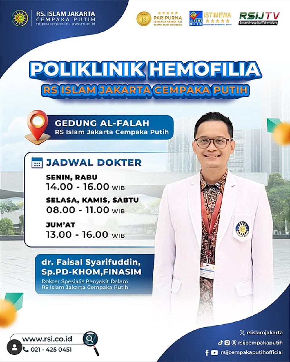 Bersama dokter spesialis penyakit dalam konsultan hematologi onkologi medik RS Islam Jakarta Cempaka Putih, dr. Faisal Syarifuddin, Sp.PD-KHOM, FINASIM, kami siap memberikan layanan terbaik untuk Anda yang membutuhkan penanganan pada gangguan pembekuan darah dan masalah kesehatan terkait lainnya.