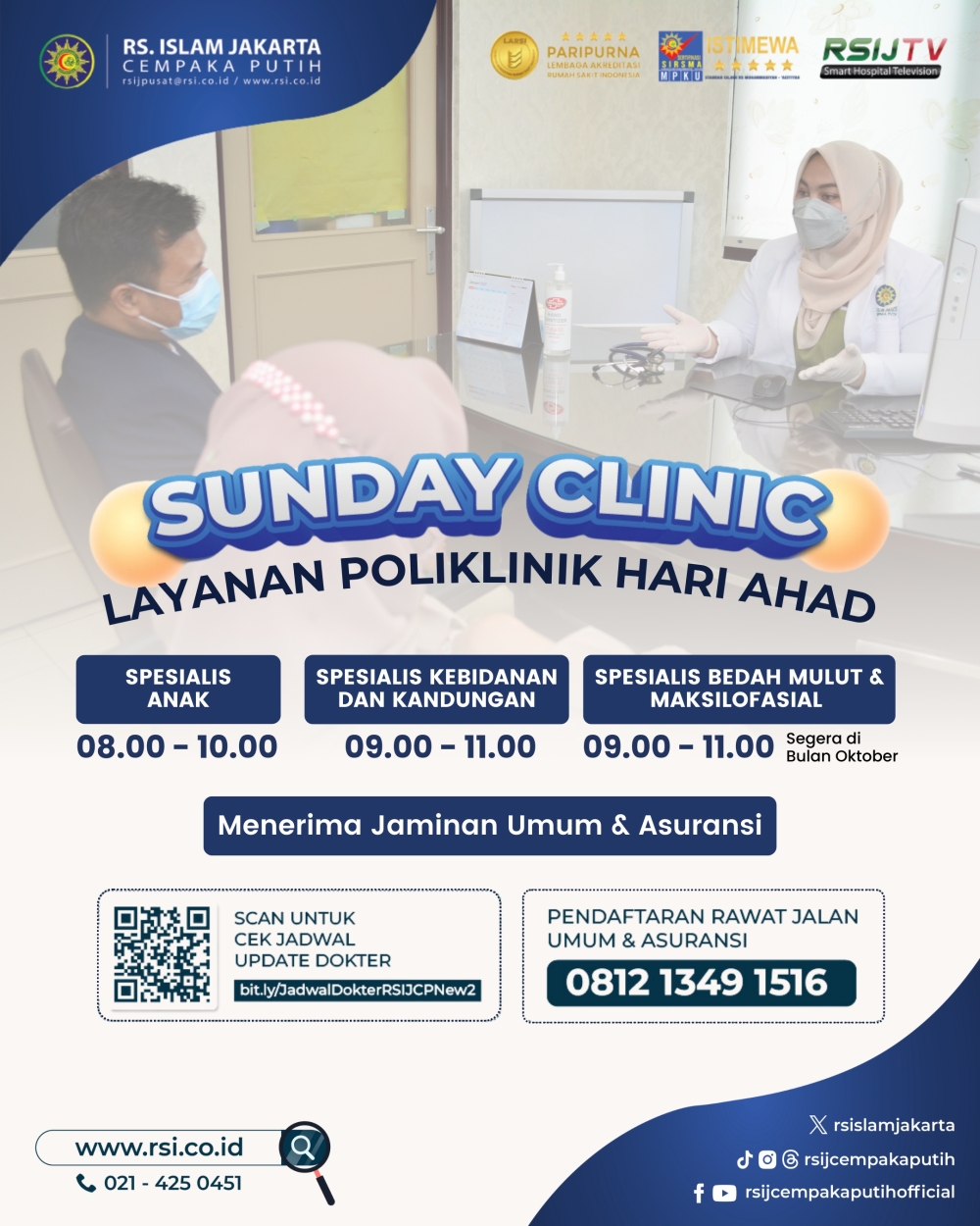 Dengan adanya Sunday Clinic, RS Islam Jakarta Cempaka Putih memberikan fleksibilitas waktu bagi pasien yang memiliki kesibukan di hari kerja. Fasilitas yang modern dan tenaga medis berpengalaman menjamin pelayanan yang berkualitas di hari Minggu, sehingga masyarakat tetap dapat mengakses layanan kesehatan yang mereka butuhkan.