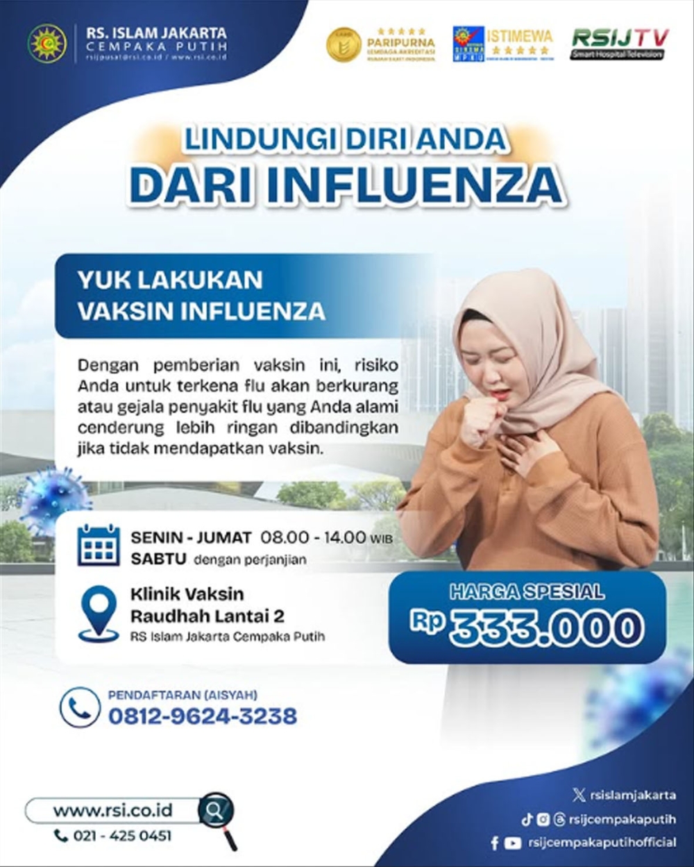 Kalau kamu mau, di RS Islam Jakarta Cempaka Putih menyediakan Vaksin Influenza loh. untuk pendaftaran bisa hubungi ke no tlp 0812-9624-3238.