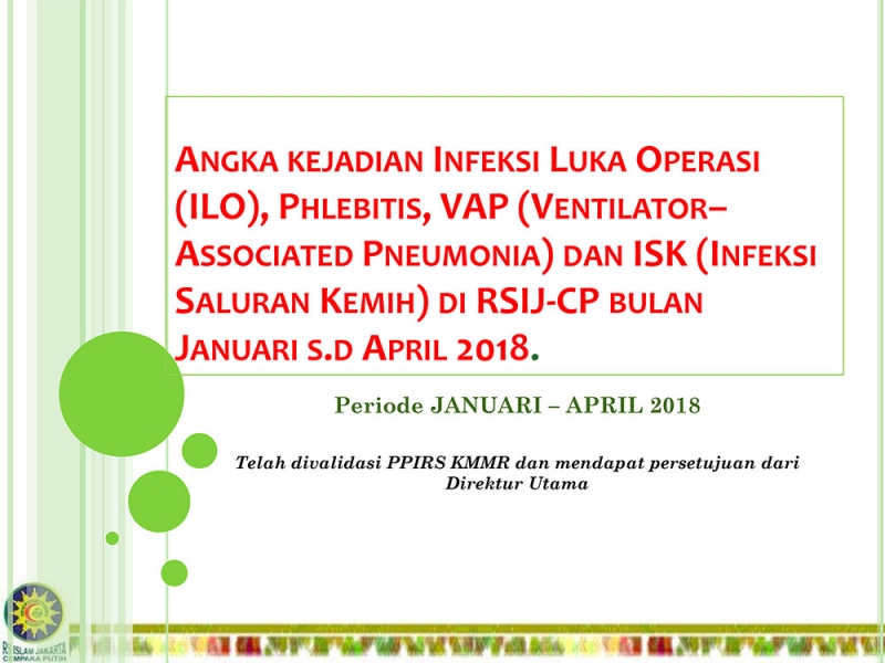 You are here:RSIJCP/Pusat Informasi/Berita & Informasi/Angka kejadian Infeksi Luka Operasi (ILO), Phlebitis, VAP (Ventilator–Associated Pneumonia) dan ISK (Infeksi Saluran Kemih) di RSIJ-CP bulan Januari s.d April 2018
