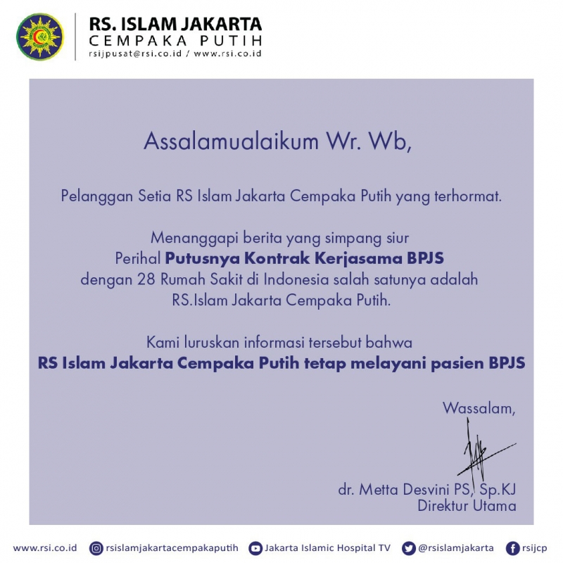 Kami luruskan informasi tersebut bahwa RS Islam Jakarta Cempaka Putih tetap melayani pasien BPJS