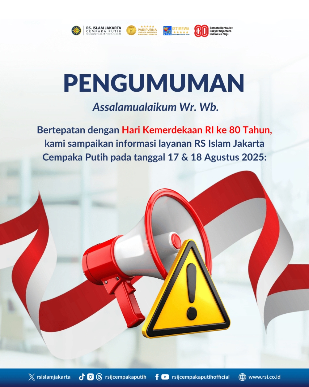 Bertepatan dengan Hari Kemerdekaan RI ke 80 Tahun, kami sampaikan informasi layanan RS Islam Jakarta Cempaka Putih pada tanggal 17 & 18 Agustus 2025 sebagai berikut: